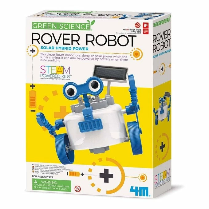 The Green Science Rover Robot introduces you to solar hybrid power! This clever Rover Robot rolls along on solar power when the sun is shining.