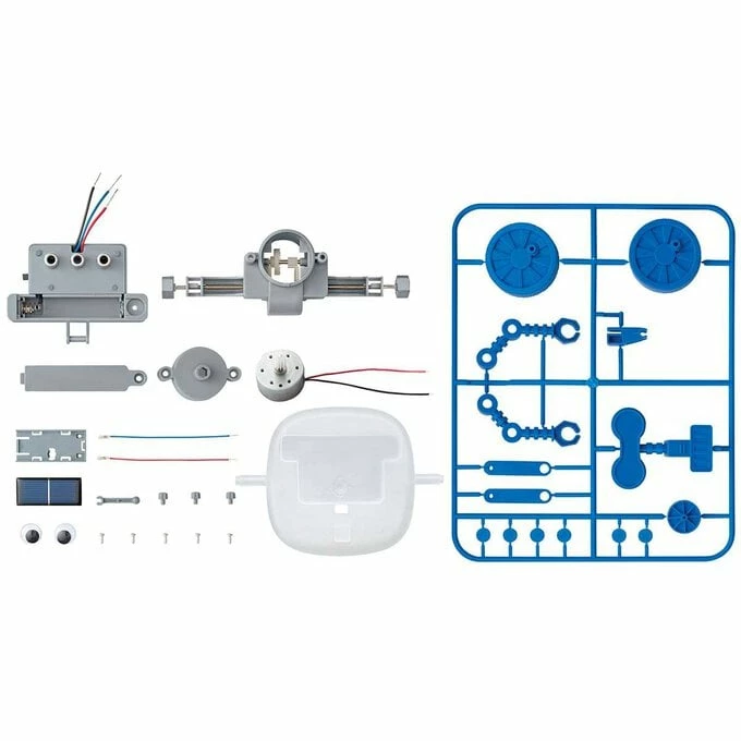 - Includes body, gearbox, rear wheel, six joint plugs, two cranks, eye support, left and right arms, two large wheels, battery holder, solar panel holder, motor, battery cover, solar panel, solar panel support arm, motor cover, pair of wires, two eyes, five screws and three terminal caps