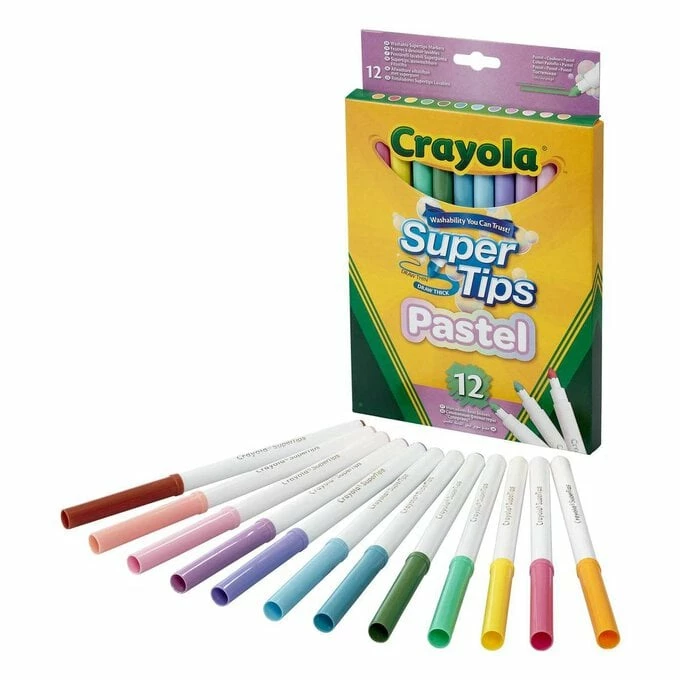 Crayola Supertips make thick or thin lines and are designed to give smooth intense colour laydown, no squeaks or drags and the inks wash off skin and clothing. There are 12 pastel colours included in the pack, all great for writing, drawing and colouring.