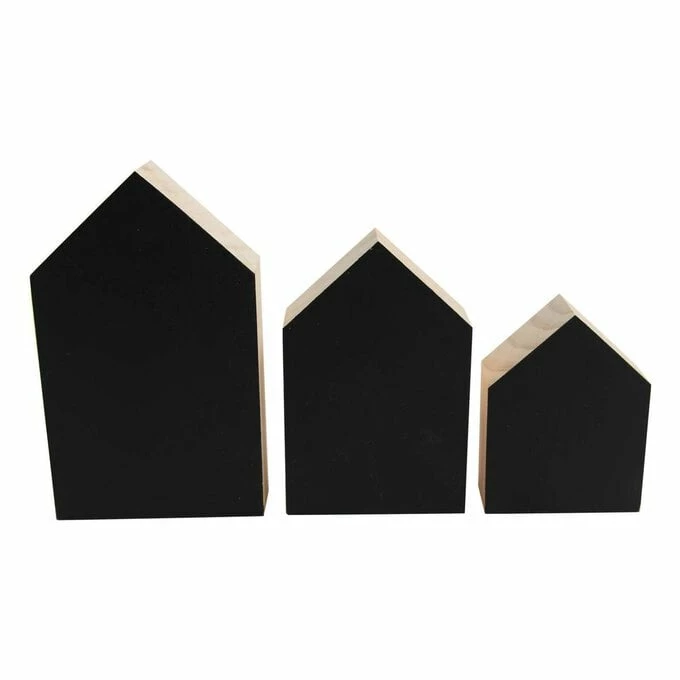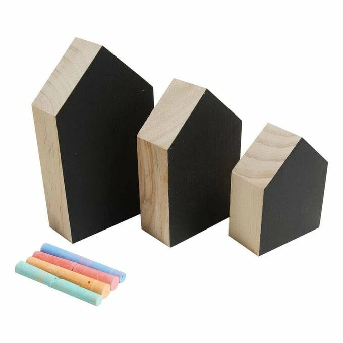 There are three chalkboard houses included in the set, each of which is made of wood with a blackboard surface on one side. They can be stood on any flat surface for display.